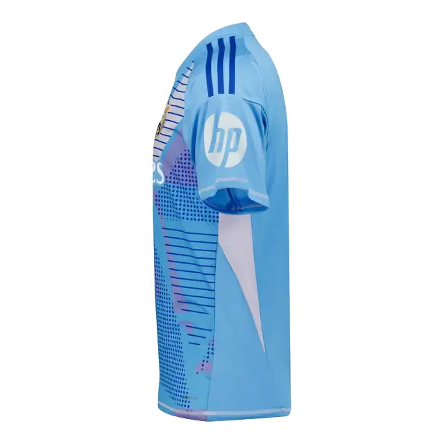 Com um design moderno e elegante, a camisa é predominantemente azul e traz detalhes em branco nas mangas e nos ombros, além de contar com as famosas três listras da Adidas, patrocinadora do Real Madrid. O escudo do time está presente no lado esquerdo do peito, simbolizando toda a tradição e história do clube.